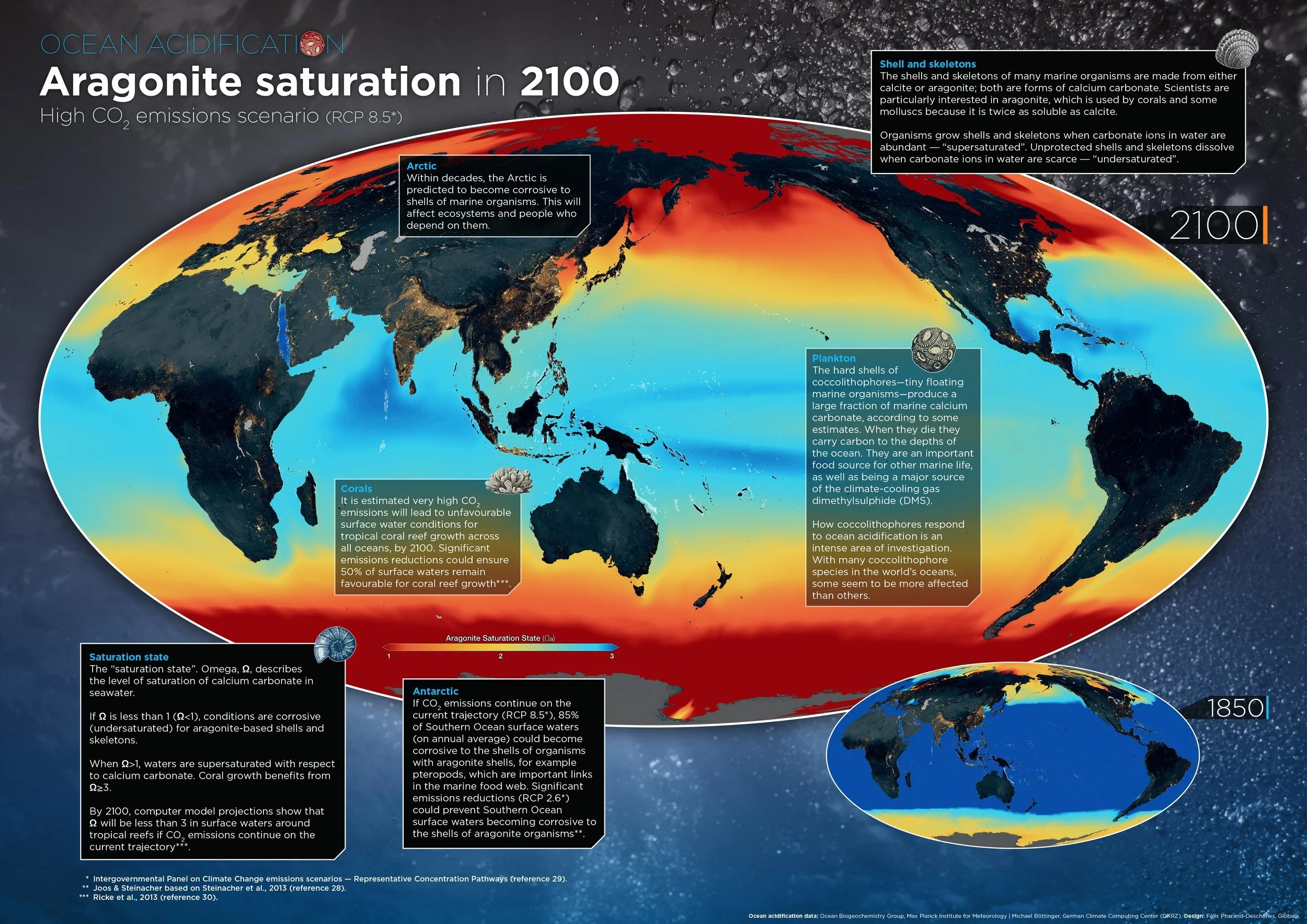 Aragonite saturation is a key parameter in ocean chemistry that reflects the concentration of aragonite, a form of calcium carbonate, in seawater. It is an essential measure of the ability of marine organisms, such as shellfish, corals, and some plankton, to build and maintain their shells or skeletons. Projections for 2100, based on various emission scenarios, suggest that the global average aragonite saturation state will continue to decline.