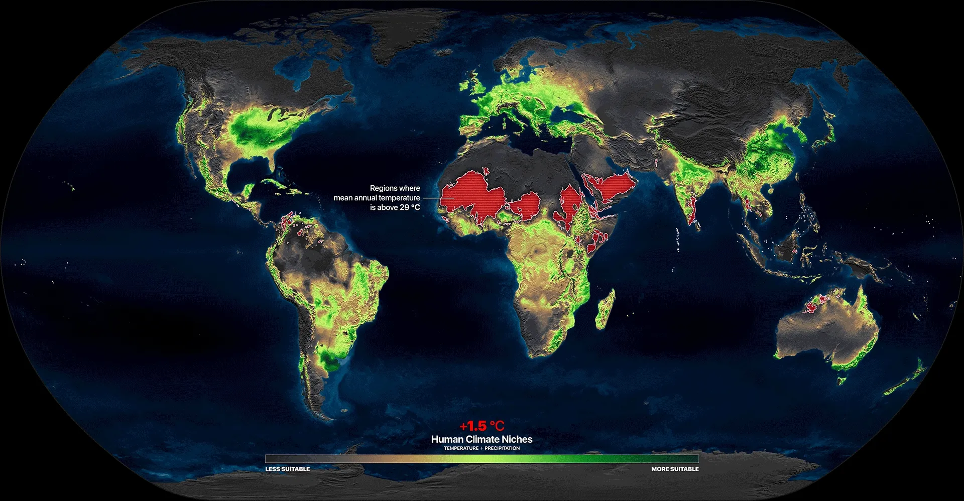 Alternative Colors. Human Climate Niches in green ■ and regions of Mean Annual Temperature >29 °C (MAT >29 °C) in red ■.