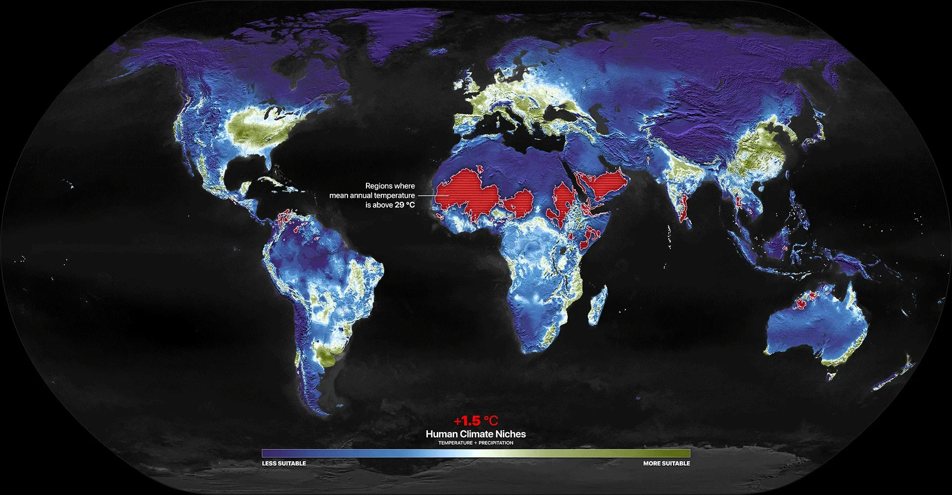 Human Climate Niches in green ■ and regions of Mean Annual Temperature >29 °C (MAT >29 °C) in purple ■. The MAT >29°C is an important threshold as beyond this point, humans are exposed to historically unprecedented levels of heat, with an increased frequency of potentially lethal maximum temperatures over 40°C and physiologically challenging wet bulb temperatures (WBT) over 28°C, posing serious threats to health and survival.