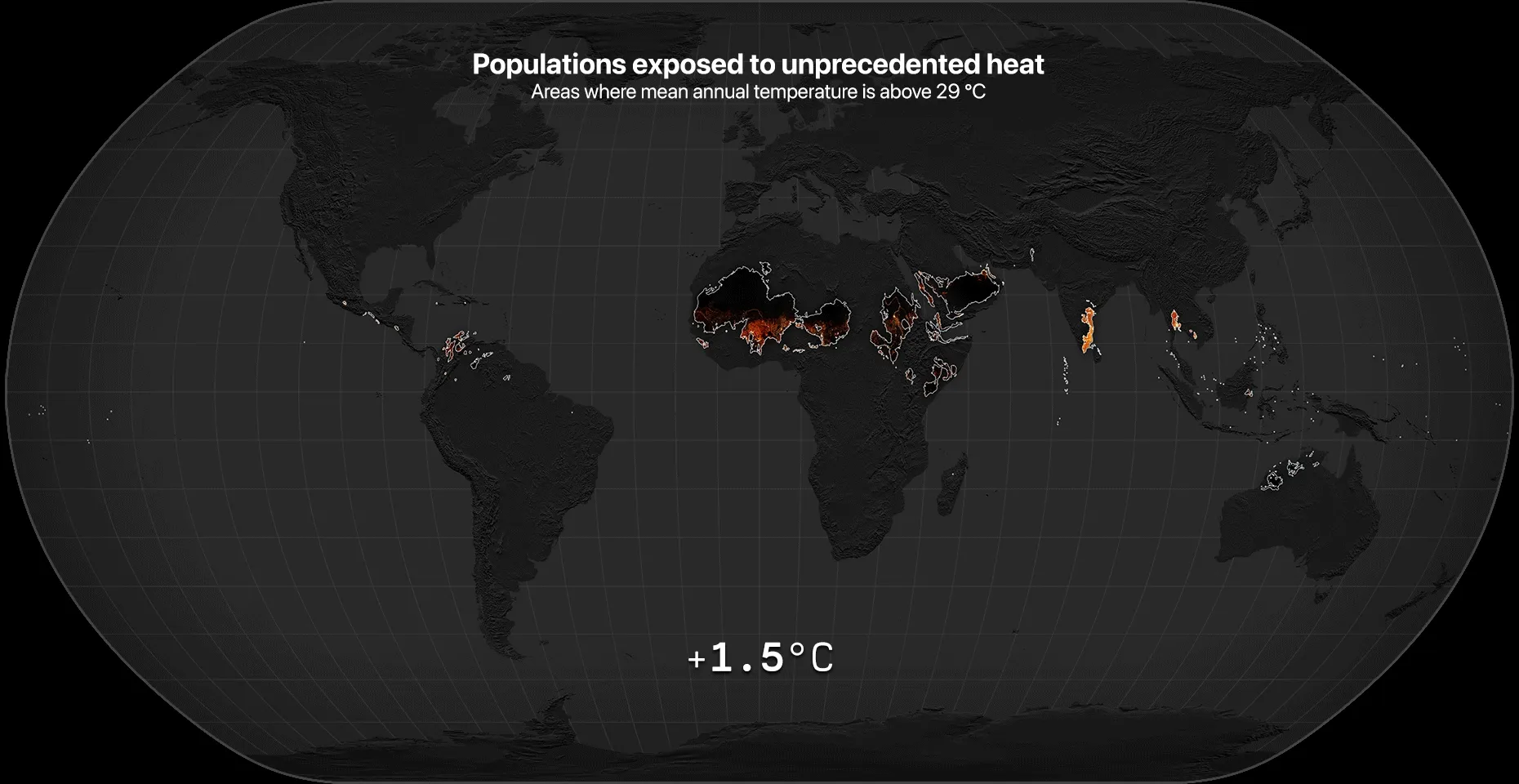 Projected populations exposed to unprecedented heat as global average temperature rises. This animation shows parts of the world where the mean annual temperature will be above 29C – dangerously hot for humans – at 1.5C of global warming, then at 2.7C warming. Finally, it combines 2.7C warming with “human presence” – revealing the densely populated areas that could be affected. Credit: Lenton, Chi, et al. and Globaïa