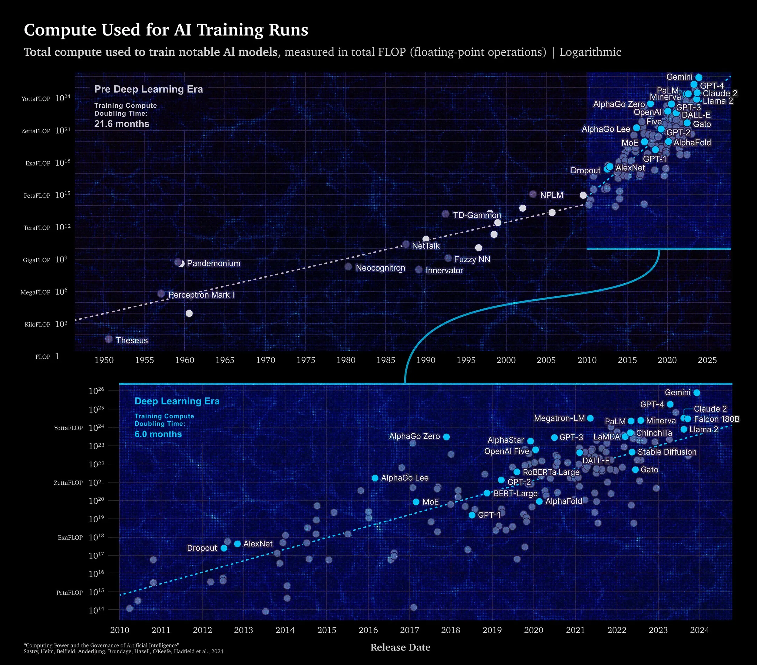 - The Large-Scale Era: Starting between 2015 and 2016, a distinct trend emerged, characterised by models developed by major corporations that employed training compute on a scale 2-3 orders of magnitude larger than systems adhering to the Deep Learning Era trend within the same timeframe. Interestingly, the growth rate of compute for these Large-Scale models appears to be slower, with a doubling time of approximately 10 months. Data: Jaime Sevilla, Lennart Heim, Anson Ho, Tamay Besiroglu, Marius Hobbhahn, Pablo Villalobos, Compute Trends Across Three Eras of Machine Learning. 2022. arXiv:2202.05924 Figure: Adapted from: Sastry, G., Heim, L., Belfield, H., Anderljung, M., Brundage, M., Hazell, J., O’Keefe, C., Hadfield, G. K., Ngo, R., Pilz, K., Gor, G., Bluemke, E., Shoker, S., Egan, J., Trager, R. F., Avin, S., Weller, A., Bengio, Y., & Coyle, D. Computing power and the governance of artificial intelligence. 2024. arxiv.org/2402.08797