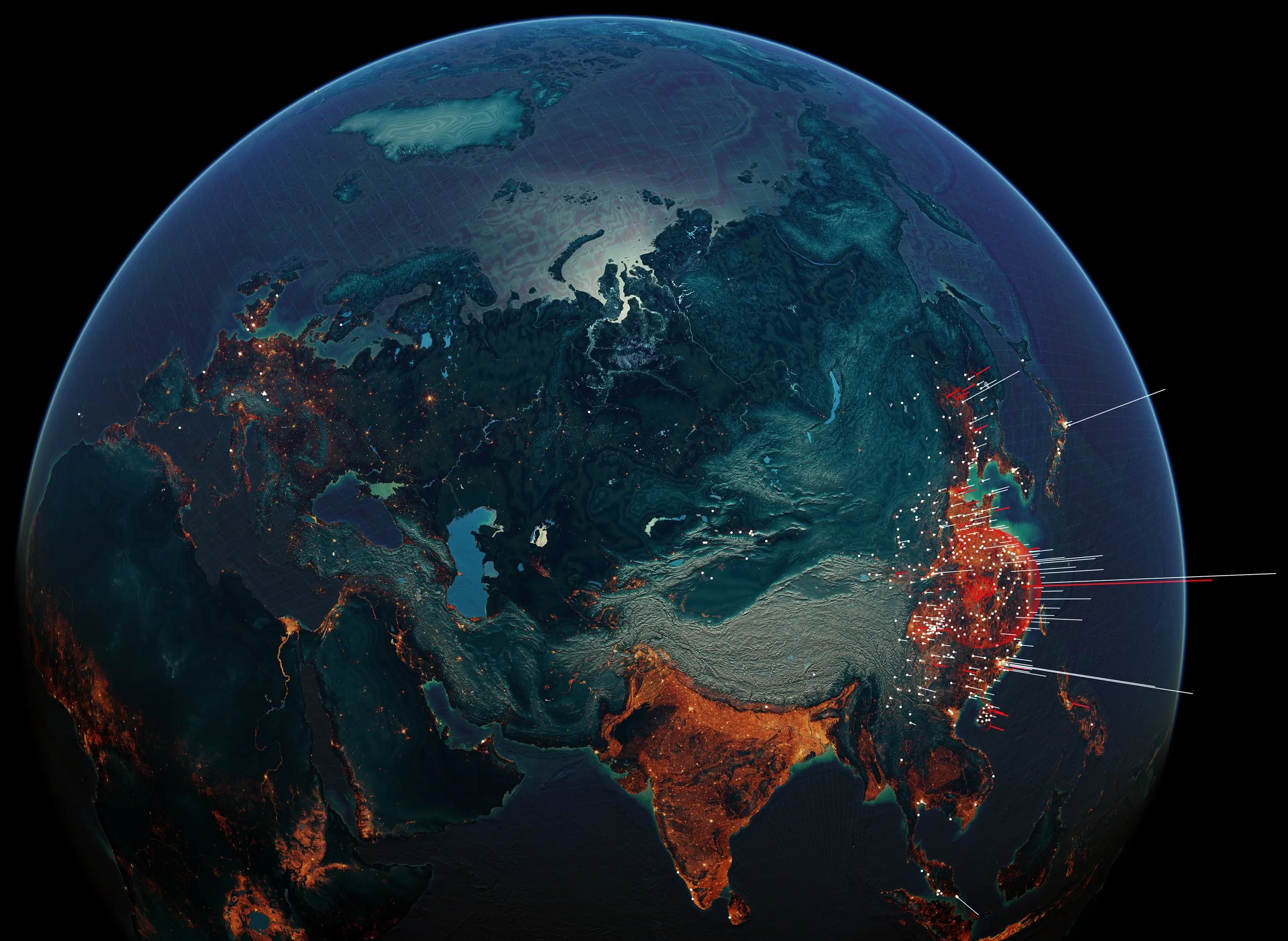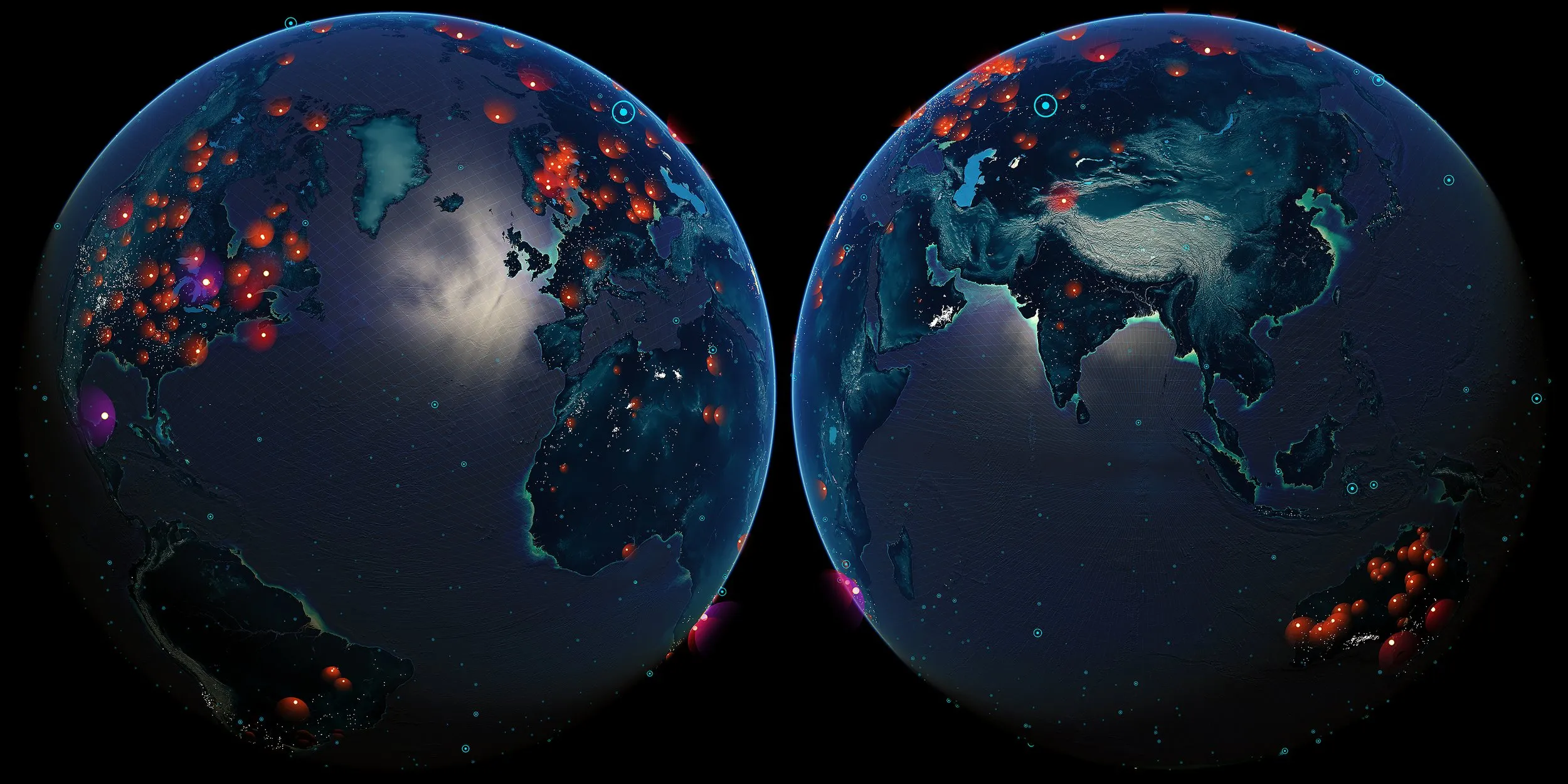 Atomic Planet — Past nuclear tests are depicted with spikes, while a blue sphere symbolises the presence of a nuclear reactor. The ‘ripple effect’ around reactors is showing the presence of antineutrinos produced as a byproduct of nuclear fission reactions that occur within these nuclear reactors.