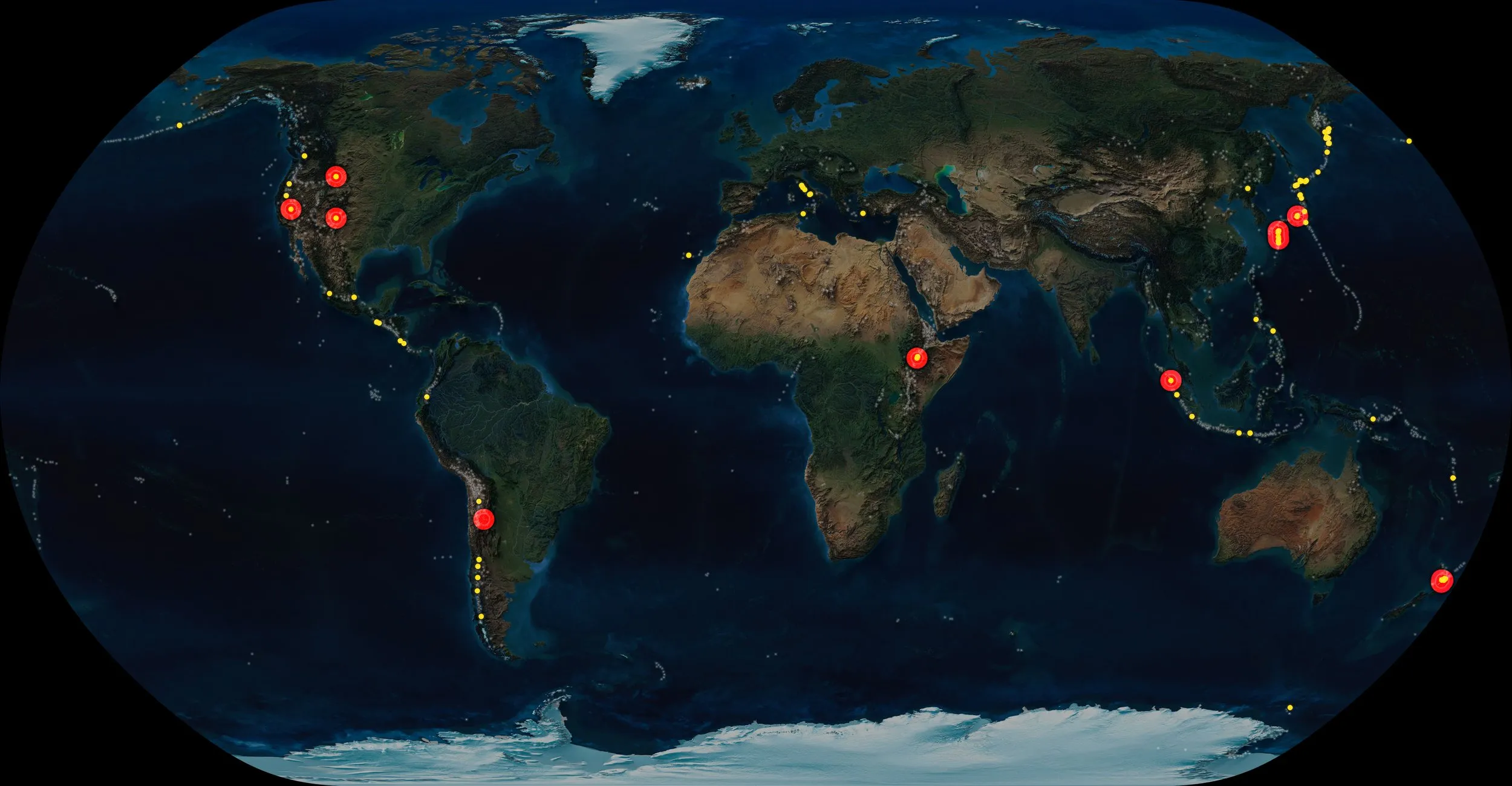 Large Magnitude Explosive Volcanic Eruptions — This map illustrates the most significant volcanic eruptions that took place during the Quaternary period (the last 2.58 million years). 🟡 Yellow markers indicate eruptions with a Volcanic Explosivity Index (VEI) of 7, such as the Tambora eruption in 1815, the Krakatoa eruption in 1883, and the Santa Maria eruption in 1902. 🔴 Red markers represent even more powerful eruptions with a VEI of 8, including the Toba eruption around 74,000 years ago, the Yellowstone eruption around 640,000 years ago, and the Taupo eruption approximately 26,500 years ago. Data: Large Magnitude Explosive Volcanic Eruptions (LaMEVE) Dataset