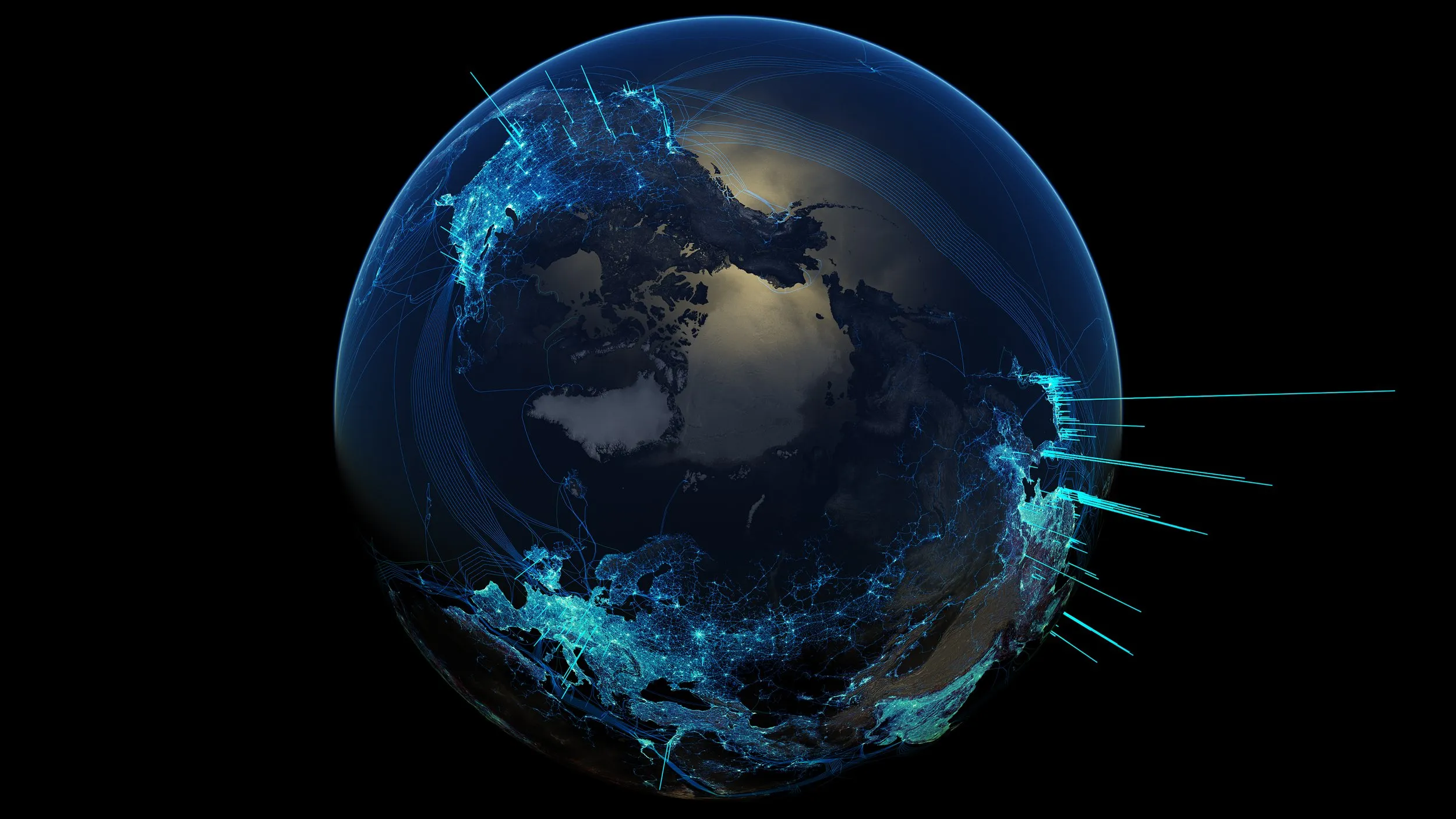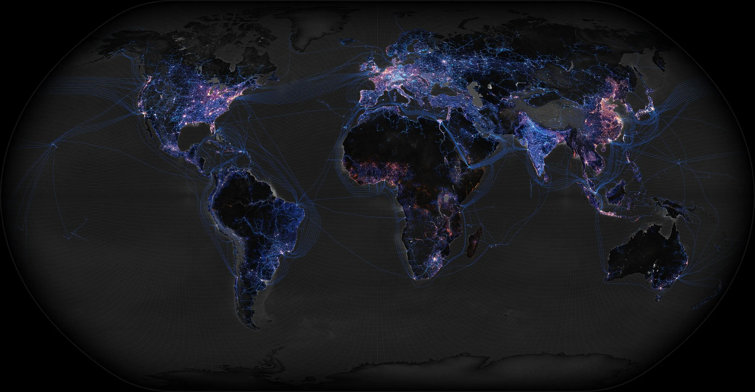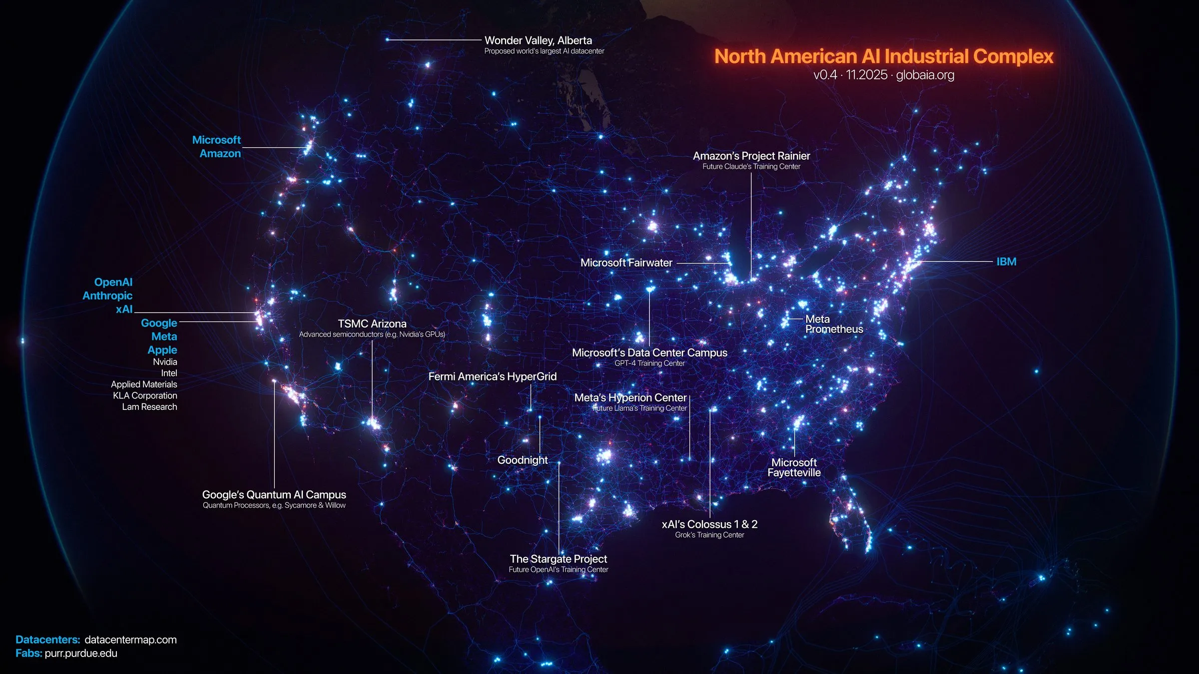 The immense scale of the AI boom, driven by cloud computing infrastructures and data centers powering the training of frontier AI models from companies like OpenAI, Anthropic, and DeepMind. Each blue dot represents a data center, the critical hubs of this technological revolution. The visualization intricately maps the transmission lines and submarine cables that form the backbone of the technosphere, illustrating the communication networks enabling the Internet. These networks carry and store the vast repository of humanity’s collective output—texts, videos, and sounds—used to train multimodal large language models, showcasing the interconnected systems that underpin the rise of artificial intelligence.