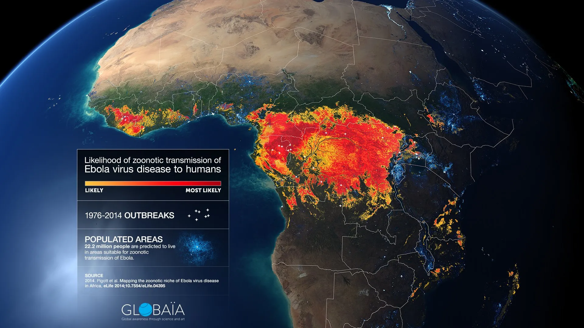 Ebola — The probability of Ebola virus transmission in Tropical Africa, as determined by population-based modeling. Source: Pigott et al. (2014) Mapping the zoonotic niche of Ebola virus disease in Africa eLife 3:e04395.
