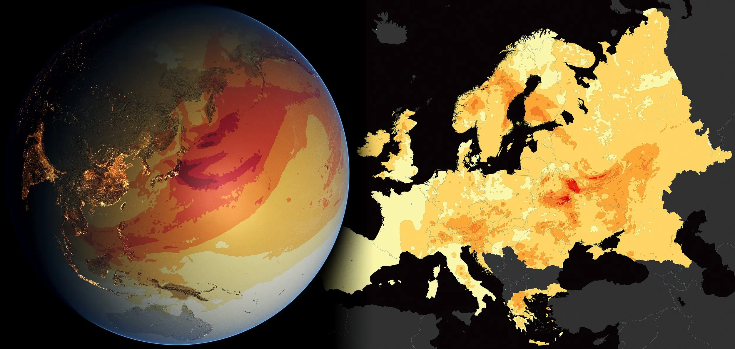 Meteorites, Impacts and Fireballs — The 🟡🟠🔴 coloured hemispheres represent all known craters created by meteorite impacts, marking the remnants of these powerful collisions on Earth’s surface. ⚪️ Tiny white dots indicate recorded meteorites discovered on the ground, tangible evidence of these extraterrestrial visitors. Meanwhile, 🔵 light blue circles signify fireballs that were observed in the atmosphere between 1988 and 2023, capturing the fleeting yet spectacular displays of these celestial events. A significant event to mention is the Chelyabinsk meteor (large blue circle) that penetrated Earth’s atmosphere in 2013, above the Southern Ural region in Russia. Data: PASSC Earth Impact Dataset | Meteoritical Bulletin Database | Center for Near Earth Object Studies · Fireball and Bolide Data