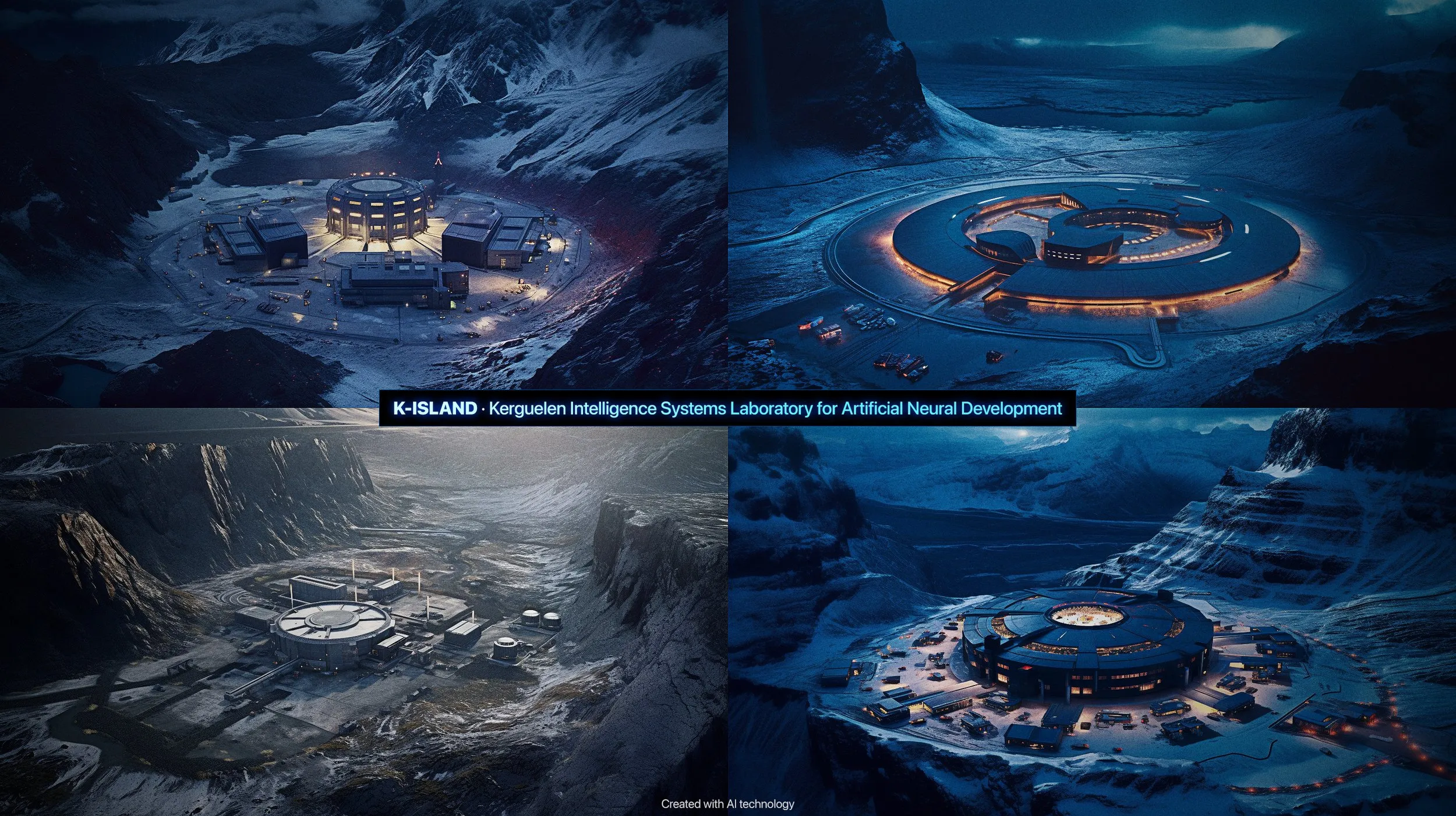 K-ISLAND · Kerguelen Intelligence Systems Laboratory for Artificial Neural Development — A sequence of AI-produced images serves as an introspective exploration of the technology’s disruptive potential and showcases its innovative prowess.