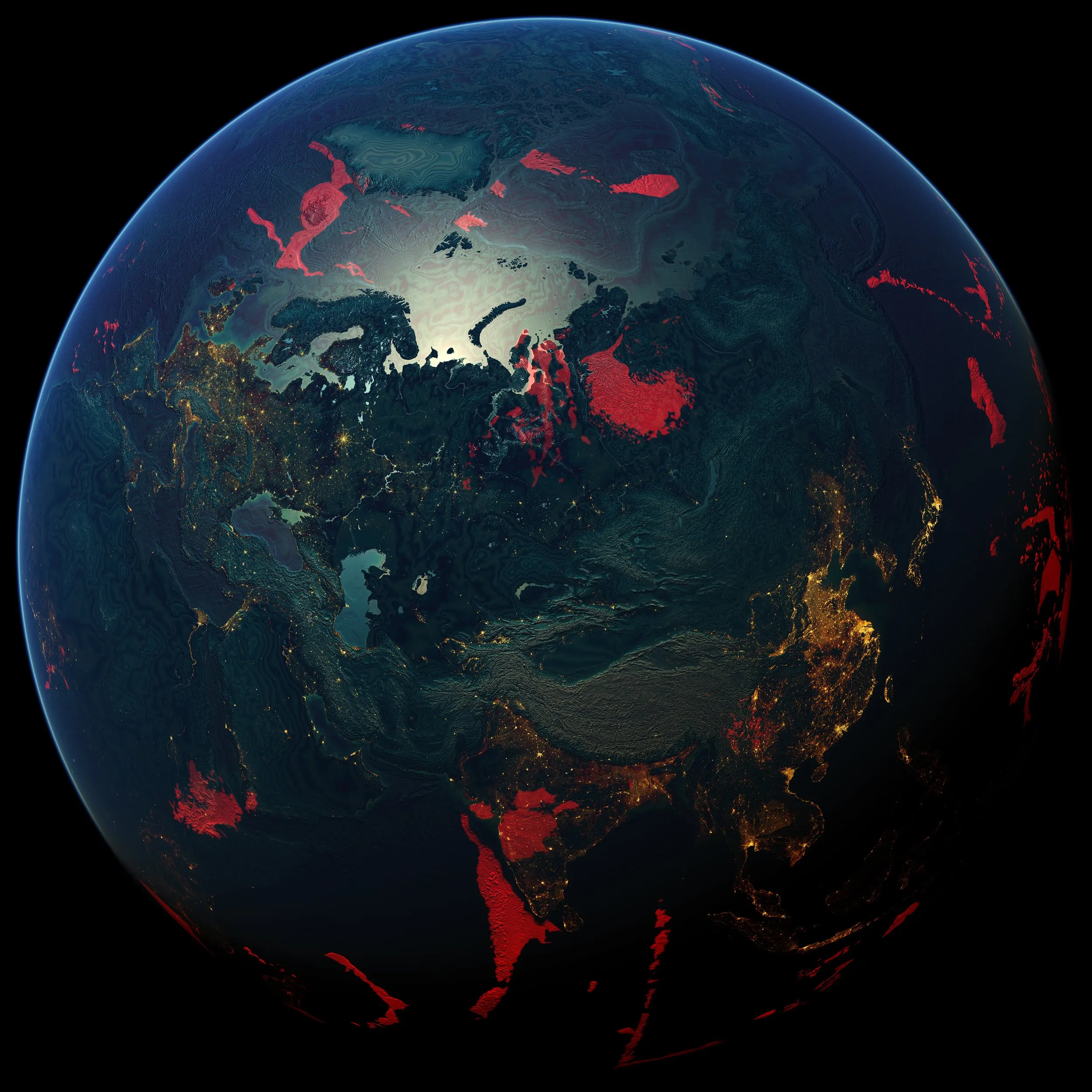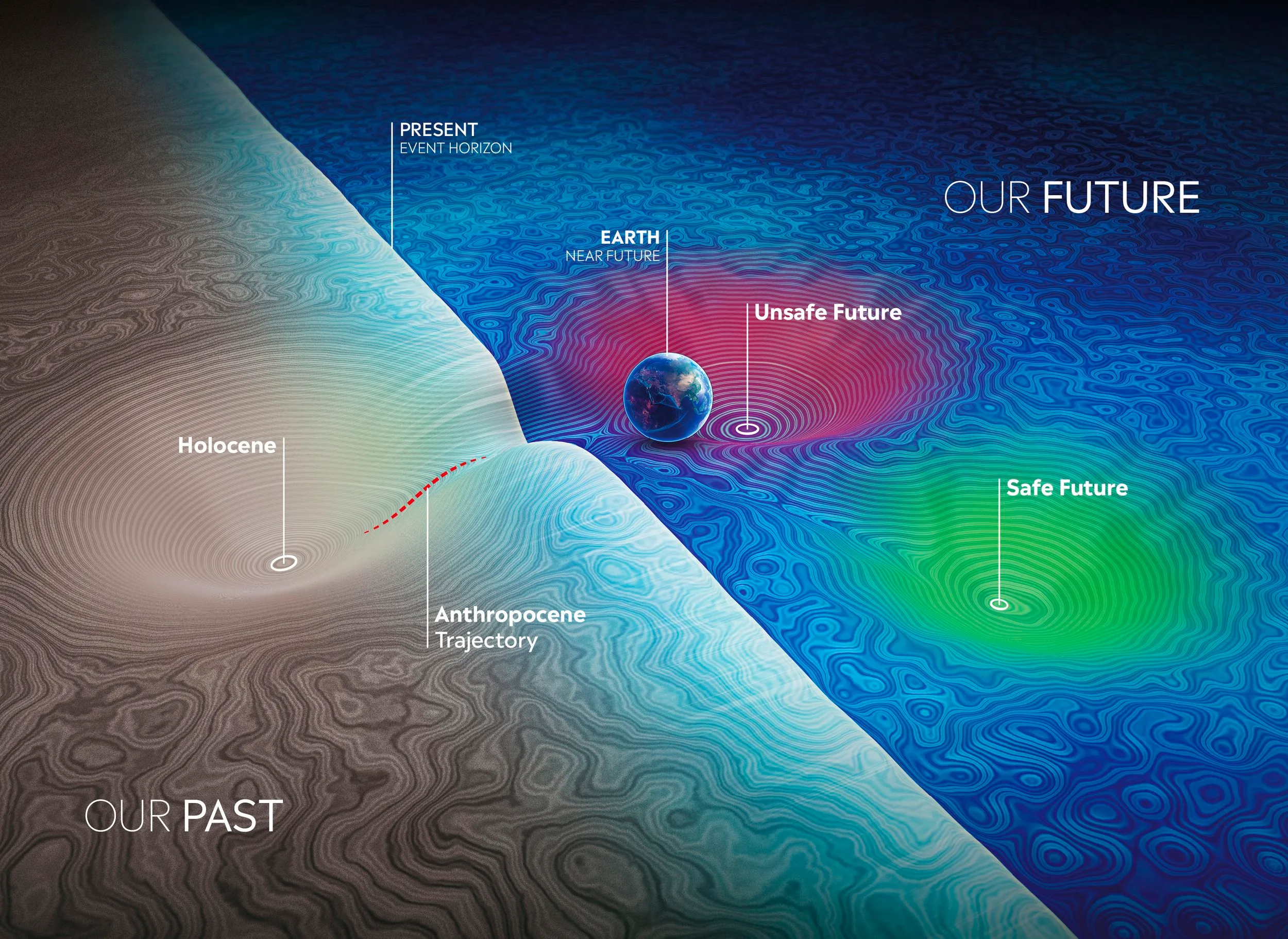 Planetary Riskscape — The stability of the Holocene era has eluded Earth, leaving us to traverse an unpredictable ocean with restricted foresight. However, science can offer glimpses into the path that lies ahead. To circumvent a perilous and inequitable future, immense endeavors and cooperation on a global level are necessary to overcome the challenges presented by the Anthropocene epoch. Our deficiency lies not in knowledge but in the unity of our collective strength. We created this image for the book Breaking Boundaries: The Science of Our Planet by Johan Rockström and Owen Gaffney.