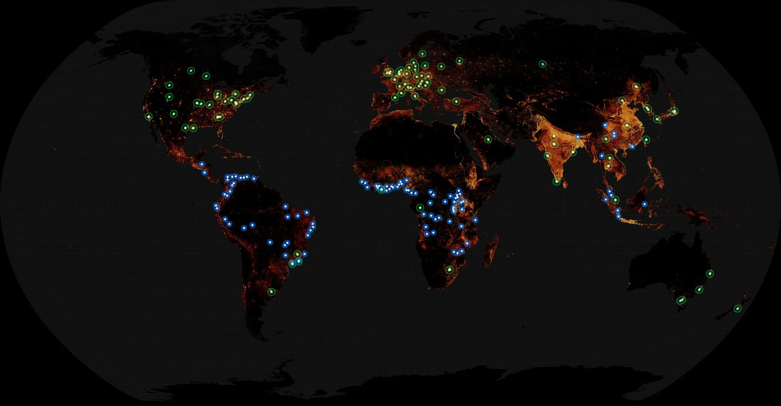 Assessing Sensitive Locations as Potential Pandemic Sources — 🔵 Bushmeat Markets required Heightened Surveillance, 🟢 High-Level Biohazard Laboratories (BHL3-4) and Wet Markets (not shown on this map for there are tens of thousands of them). Data for biolaboratories: globalbiolabs.org/map. Data for bushmeat markets: Jagadesh S, Zhao C, Mulchandani R, Van Boeckel TP. Mapping Global Bushmeat Activities to Improve Zoonotic Spillover Surveillance by Using Geospatial Modeling. Emerg Infect Dis. 2023;29(4):742-750. doi.org/10.3201/eid2904.221022