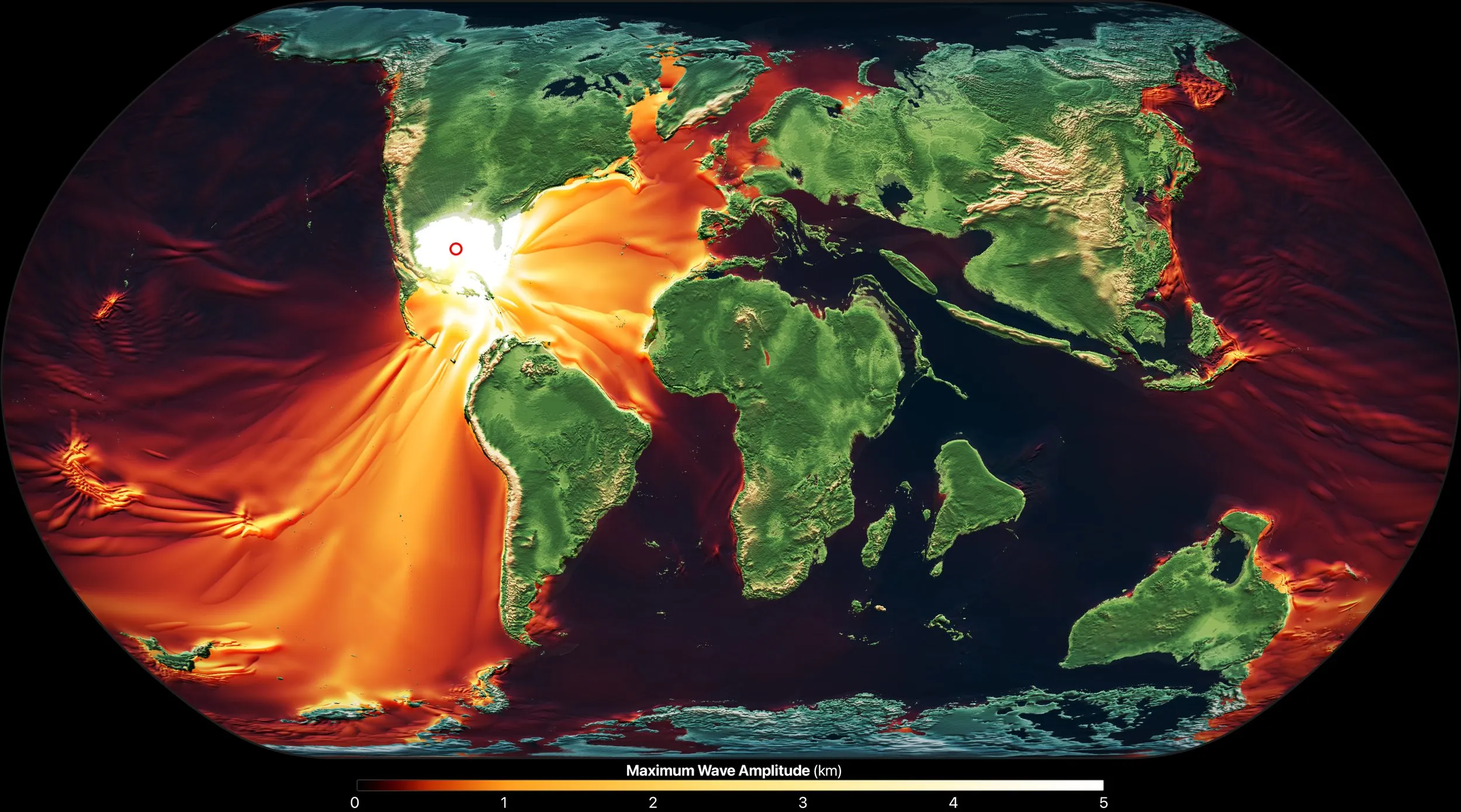 Chicxulub Impact’s Devastating Worldwide Tsunami — The Chicxulub asteroid impact 66 million years ago caused a massive global tsunami, which is seen modelled here. The vivid colours indicate waves over 10m high. Source: Range, M. M., Arbic, B. K., Johnson, B. C., Moore, T. C., Titov, V., Adcroft, A. J., et al. (2022). The Chicxulub impact produced a powerful global tsunami. AGU Advances, 3, e2021AV000627. https://doi.org/10.1029/2021AV000627